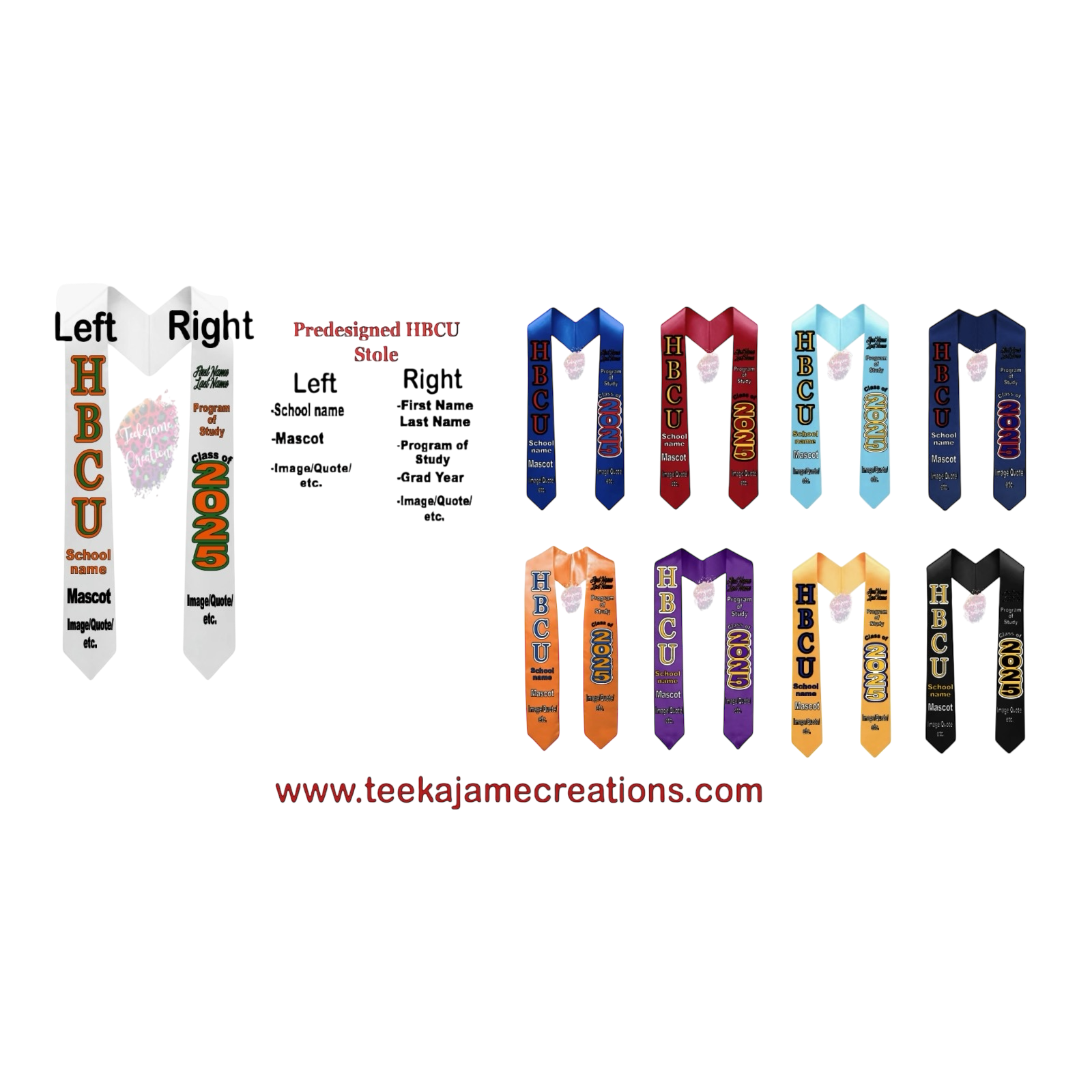 Celebrate your achievement in style with our HBCU Graduation Stoles, crafted to honor Black colleges and universities with pride. Featuring a stunning glitter finish and predesigned patterns, these stoles are perfect for standing out on graduation day.